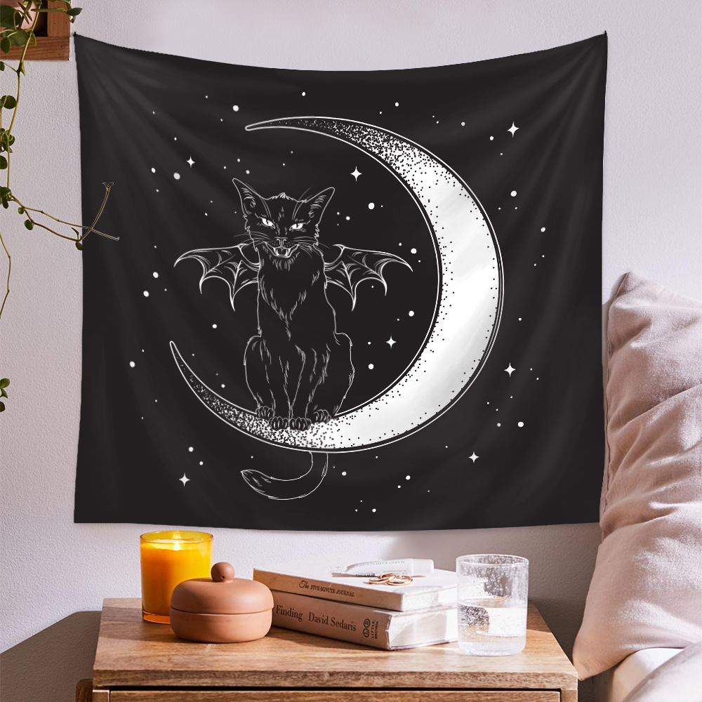 Black Cat Tapestry, Pagan Wall Hanging , Black and White Tapestry, Moon Phase Decor , Spiritual Goth Mandala ,Witchy Art for Living Room