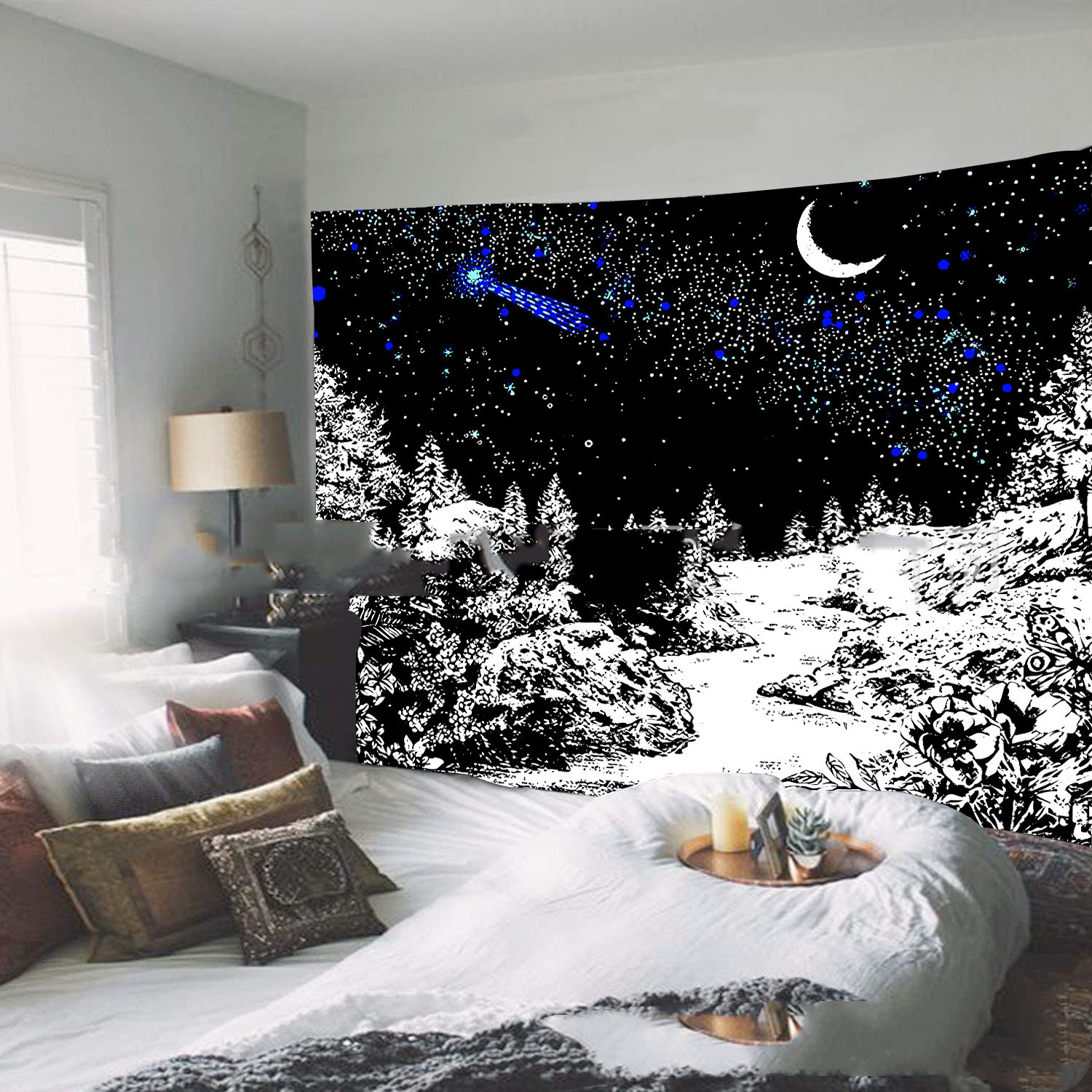 Black And White Tapestry Wall Hanging, Moon Tapestries, Mountain Landscape Wall Art, Hippie Aesthetic Mystical Goth Trippy Blue Tapestry