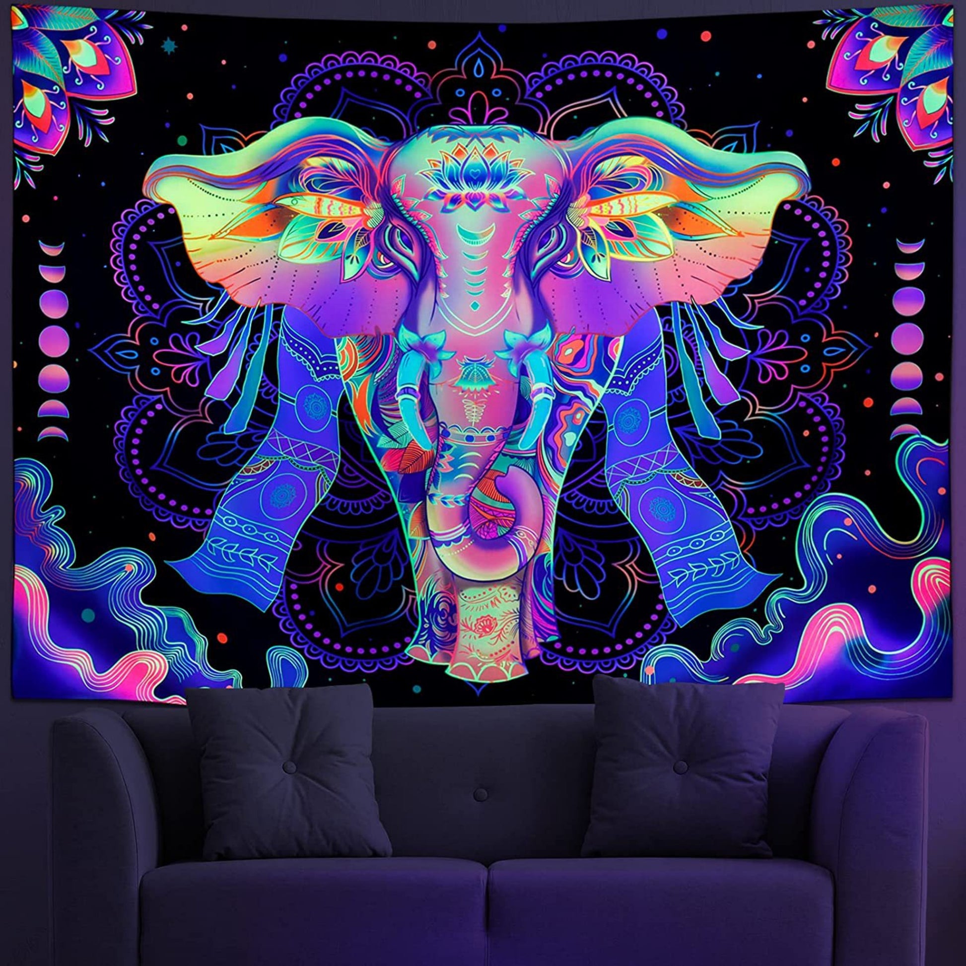 Blacklight UV Reactive Elephant Tapestry, Trippy Mandala Tapestry, Psychedelic Aesthetic Neon Hippie Décor for Living Room Dorm Bedroom