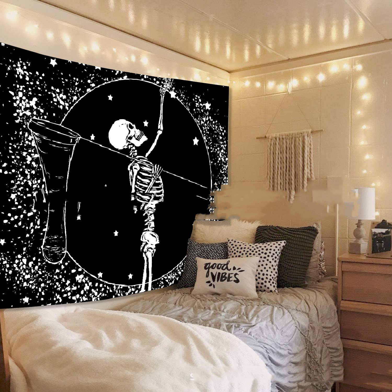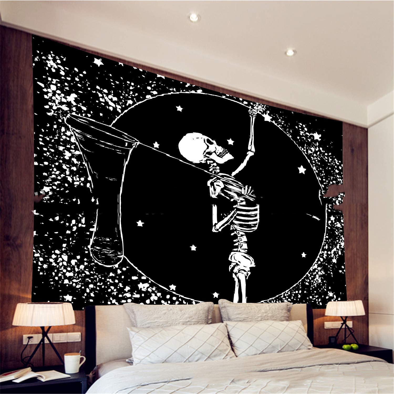 Skeleton Tapestry, Starry Night Tapestries, Skull Wall Hanging, Tarot Cloth, Black and White Tapestry, Dark Hippie Trippy Art Tapestry