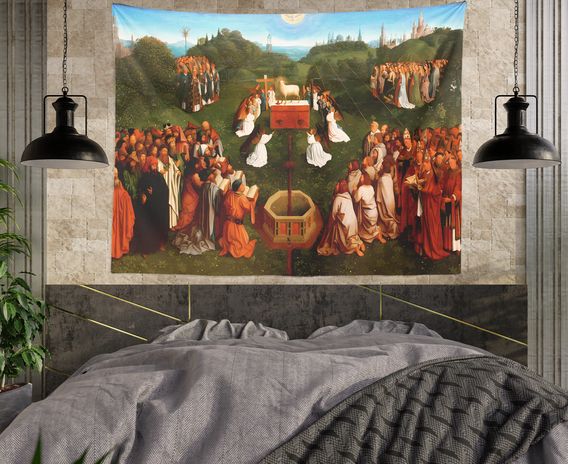 Immerse yourself in the rich detail and profound artistry of the Renaissance with our exquisite tapestry wall hanging, featuring the iconic "Adoration of the Lamb" from the Ghent Altarpiece by the master painter Jan Van Eyck. This beloved masterpiece, a pinnacle of fine art, is now reimagined as a stunning tapestry to grace your personal space, be it a sophisticated bedroom setting or an inspired college dorm.