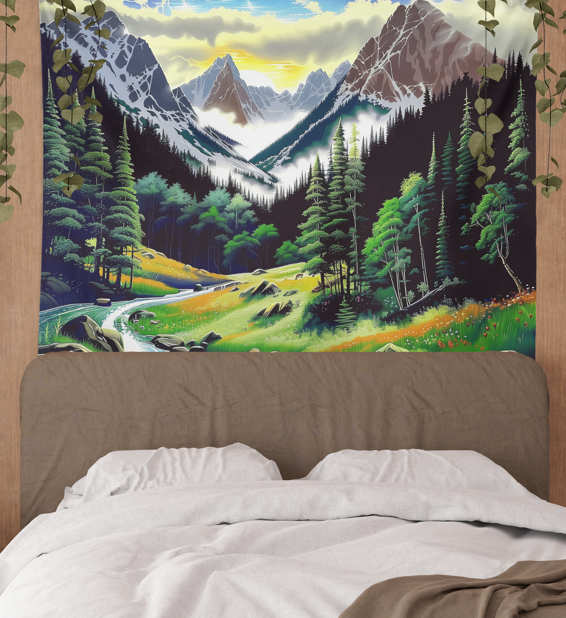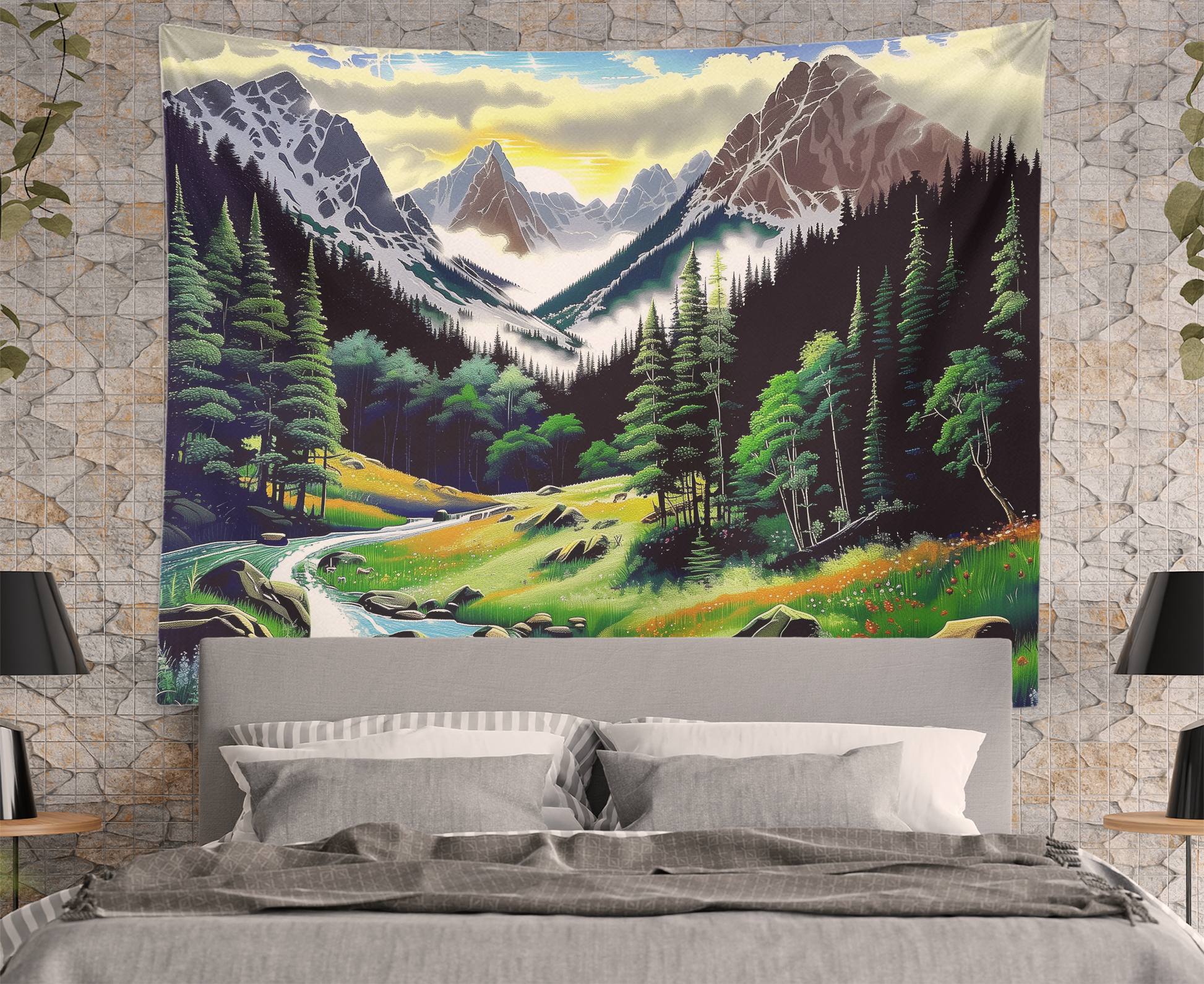 Step into the serene embrace of nature with our "Majestic Mountains" Tapestry Wall Hanging. This exquisite piece captures the essence of mountain scenery, featuring a lush forest green background interwoven with a floral mandala design, reminiscent of alpine and flowery meadows. Each detail is crafted to bring a piece of the great outdoors right into your living space, evoking the tranquility and beauty of misty meadows and rugged landscapes.
