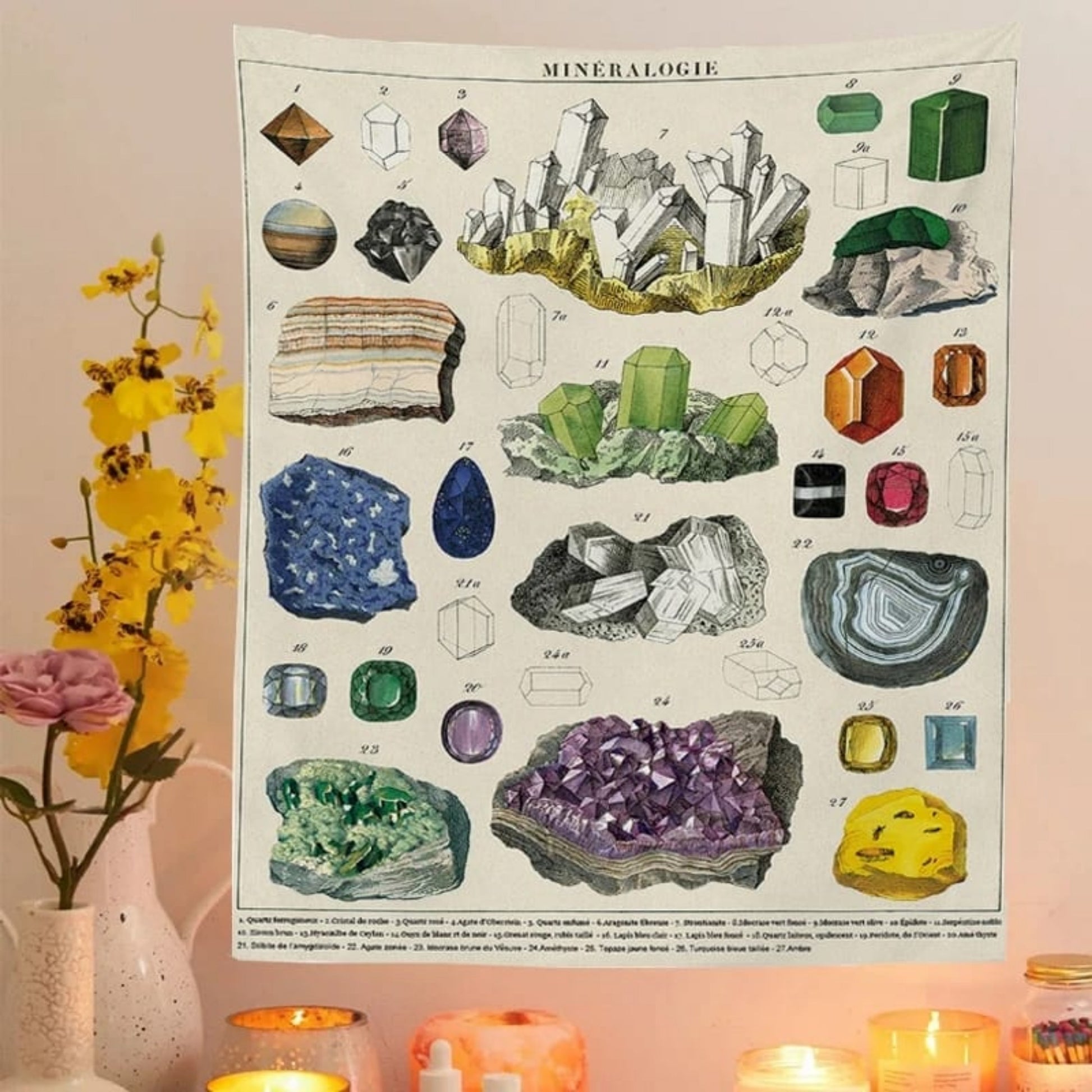Crafted with the utmost care, this Mineralogie Wall Hanging is printed on high-quality, durable fabric that captures every hue and facet with exceptional clarity. Measuring an impressive [insert size here], it's the perfect size to make a statement on any wall, while still being easy to hang and adjust. Whether you're a geology enthusiast, a lover of unique home decor, or searching for a thoughtful gift, our Science Chart is a unique and meaningful choice. To maintain the vibrant colors and intricate design, we recommend gentle hand washing and line drying.