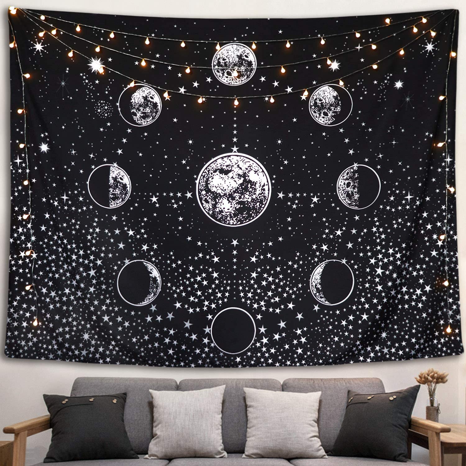 Moon Phase Tapestry , Black and White Wall Hanging, Starry Night , Sky , Universe, Galaxy Décor , Celestial Tarot Posters For Bedroom Room