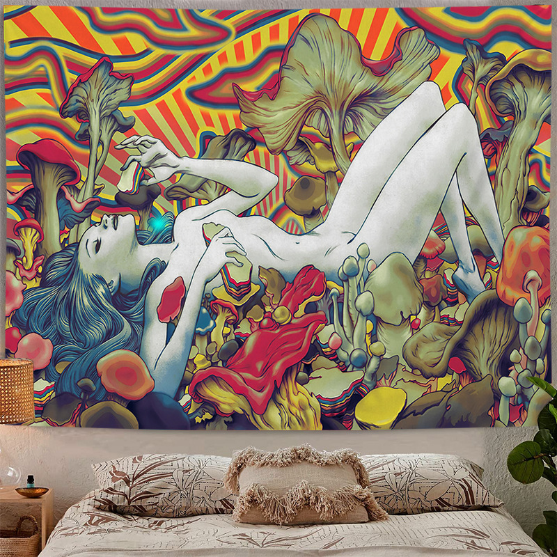 Nude Woman Tapestry, Abstract Naked Girl Lying on Trippy Mushroom Asian Psychedelic Mushroom Tapestry Wall Hanging for Bedroom Home Décor