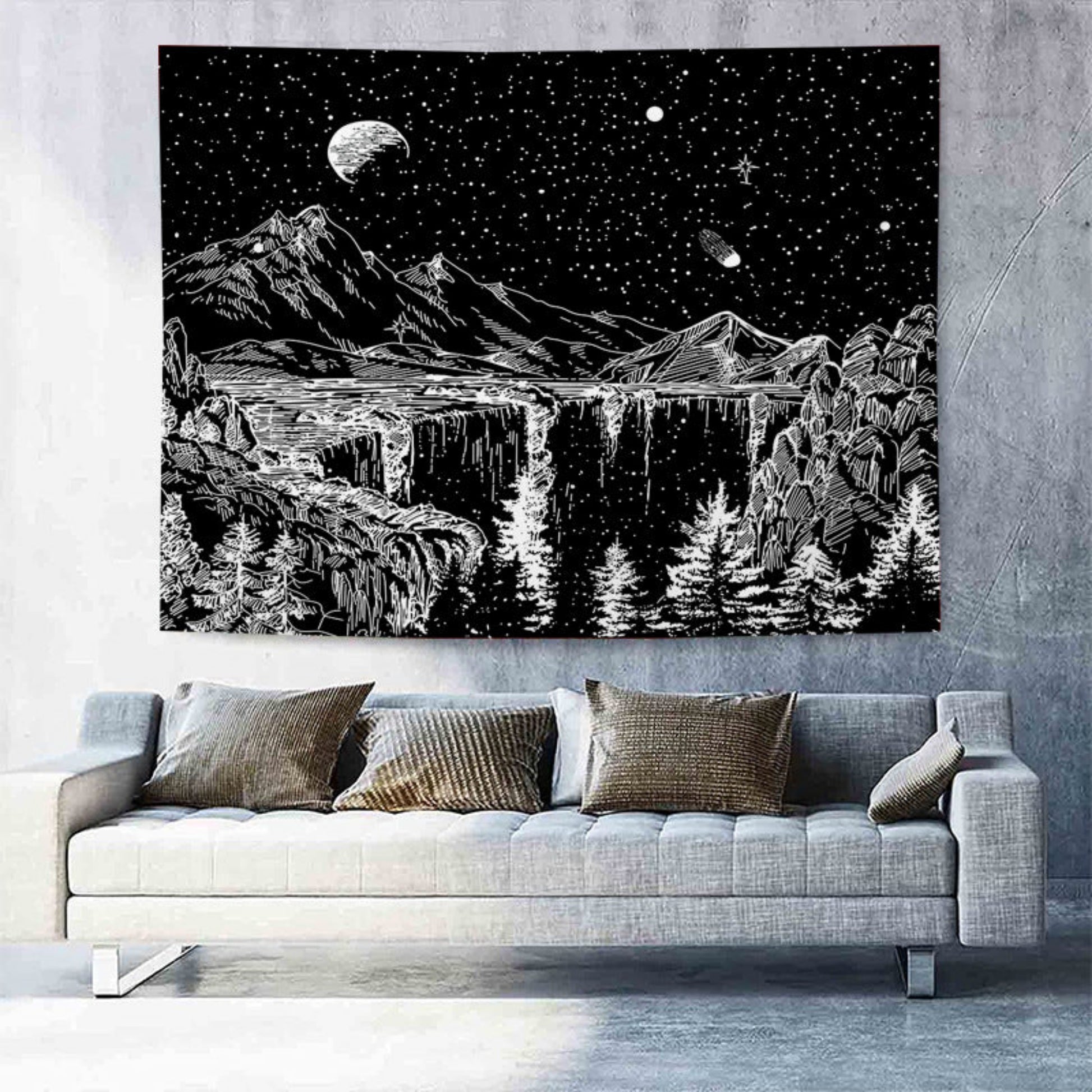 Black and White Tapestry, Starry Night Wall Hanging, Mountain Tapestry, Moon Stars Tapestry Trippy Nature Tapestry for Bedroom Living Room