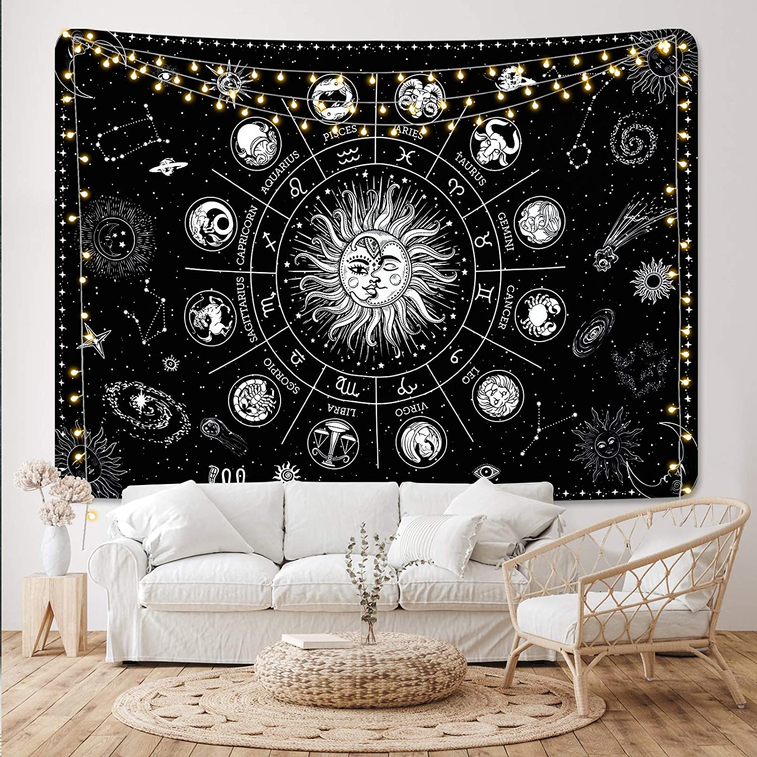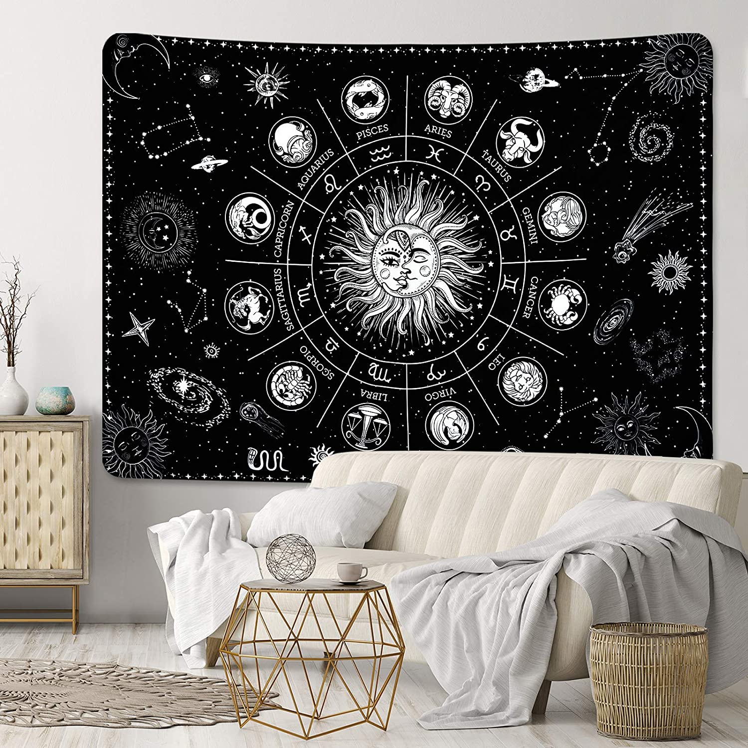 Sun and Moon Tapestry, Zodiac Wall Art , Goth Tapestry ,Black And White Wall Hanging, Tarot Cloth, Trippy Mystical Mandala,Witchy Stuff